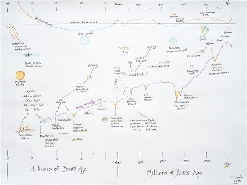 Some 3.5 billion years ago, as Earth cooled enough to sustain complex molecules, anaerobic bacteria formed, single-cell marine organisms living without oxygen and extracting energy from sulphur. Within a few hundred million years, some bacteria and algae learned to collect solar energy through photosynthesis, releasing oxygen into the sea. About 2.5 billion years ago, free oxygen became life’s first global ecological crisis.