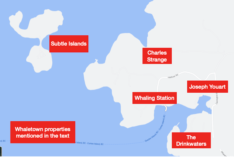 Some other families were preempting in the Whaletown area by this time. Joseph Youart received a grant for 160 acres at the top end of Whaletown Lagoon in 1900. He sold it to Alice Robertson in 1908.