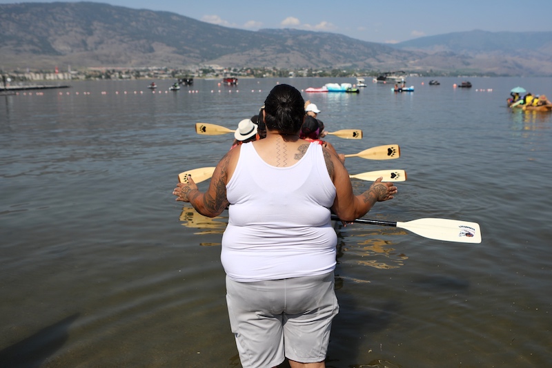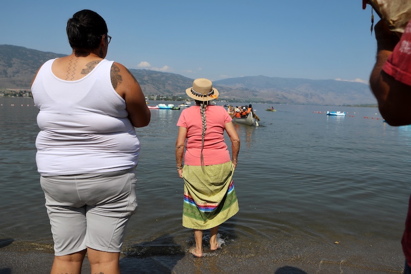 Top photo credit: Herman Edward of the Lower Similkameen Indian Band, who’s one of founders and organizers of the annual Sukʷnaqin July 4th Canoe Journey, lays down tobacco in nk’mip (Osoyoos Lake) in sw̓iw̓s (Osoyoos) in syilx homelands, prior to the launch of the cross-border canoe journey on July 4. Photo by Aaron Hemens