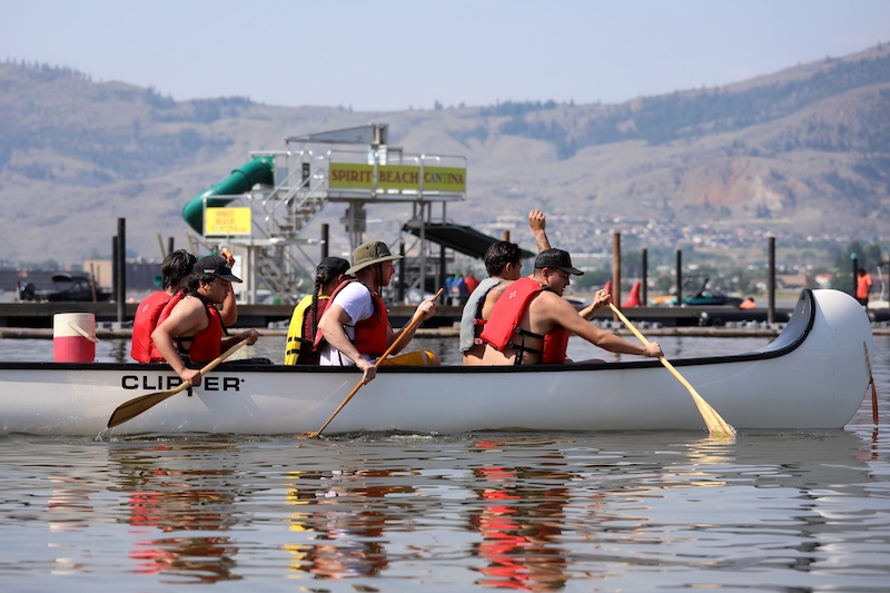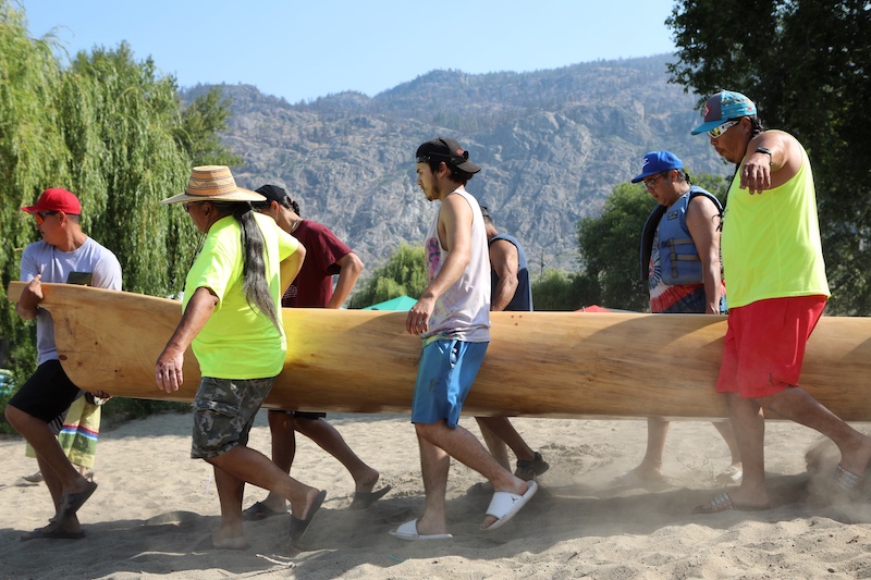 Dozens of pullers hauled at least 10 boats, including several dugout canoes, to the shore of nk’mip (Osoyoos Lake) in sw̓iw̓s (Osoyoos) in syilx homelands on Tuesday. The group sailed through the lake’s waters on the way to Oroville, Washington, before returning later in the day.