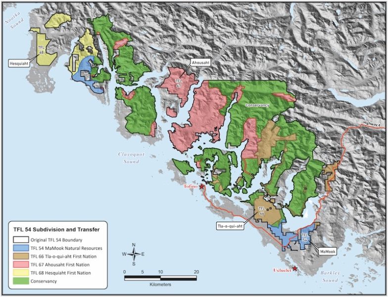 TFL 54 in Clayoquot Sound was transferred from MaMook Natural Resources, which is owned by a partnership of five central region First Nations (Ahousaht, Tla-o-qui-aht, Hesquiaht, Toquaht and Yuułuʔiłʔatḥ), and reconfigured into TFL 66, TFL 67 and TFL 68.