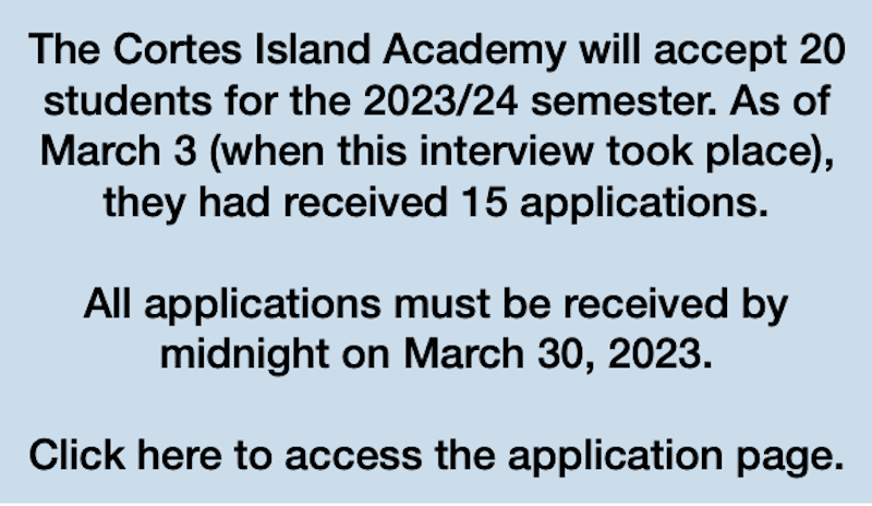 “The other thing that’s different this year that’s pretty big is that we are charging an academy fee. It’s a pretty hefty one for a lot of students. So in order to make sure that we continue to be absolutely accessible to students in rural and remote communities, often who have fewer financial resources, we have, thanks to our partnership with the Cortes Island Community Foundation, been able to promise to meet a hundred percent of the need for the cost of the program of every student who gets in this year.”