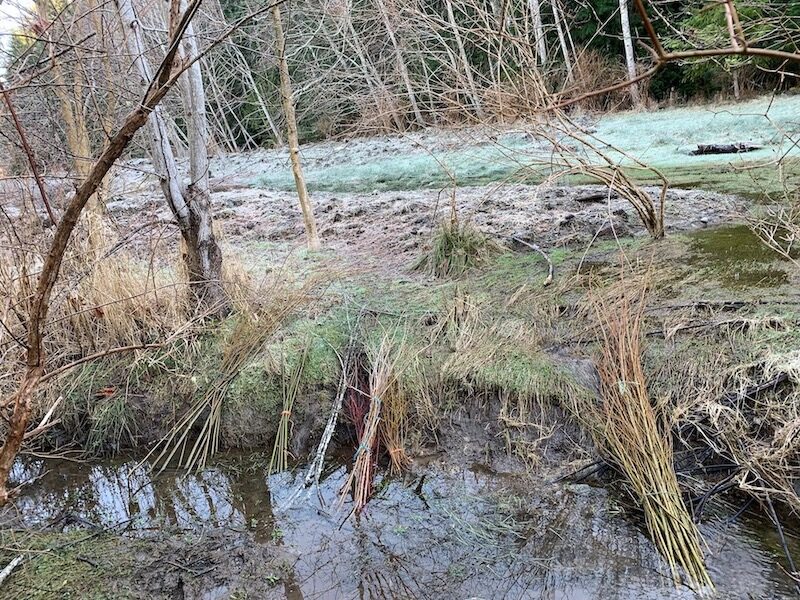 The work last Saturday consisted of planting live stakes—live cuttings from trees—along the banks of the creek to prevent soil erosion and provide habitat for wildlife.