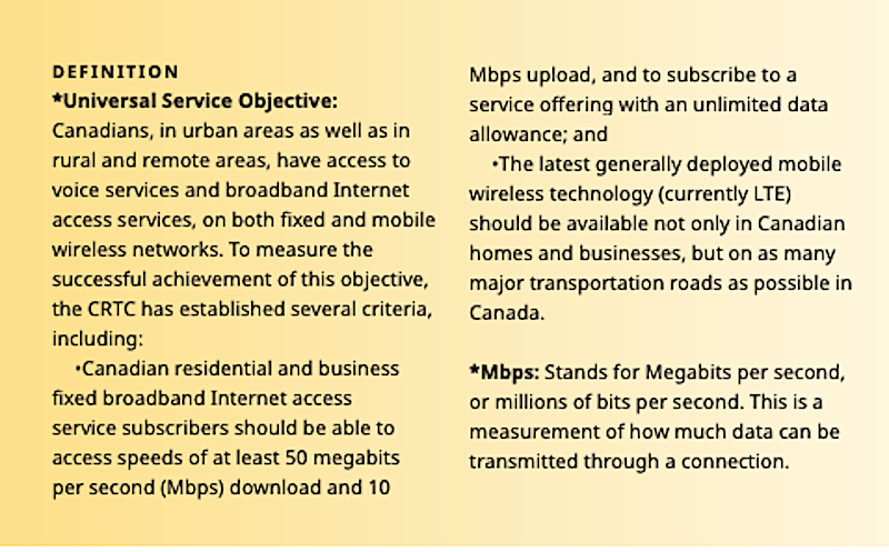 According to the Canadian Radio-television and Telecommunications Commission (CRTC), “Canadian residential and business fixed broadband Internet access service subscribers should be able to access speeds of at least 50 megabits per second (Mbps) download and 10 Mbps upload.”