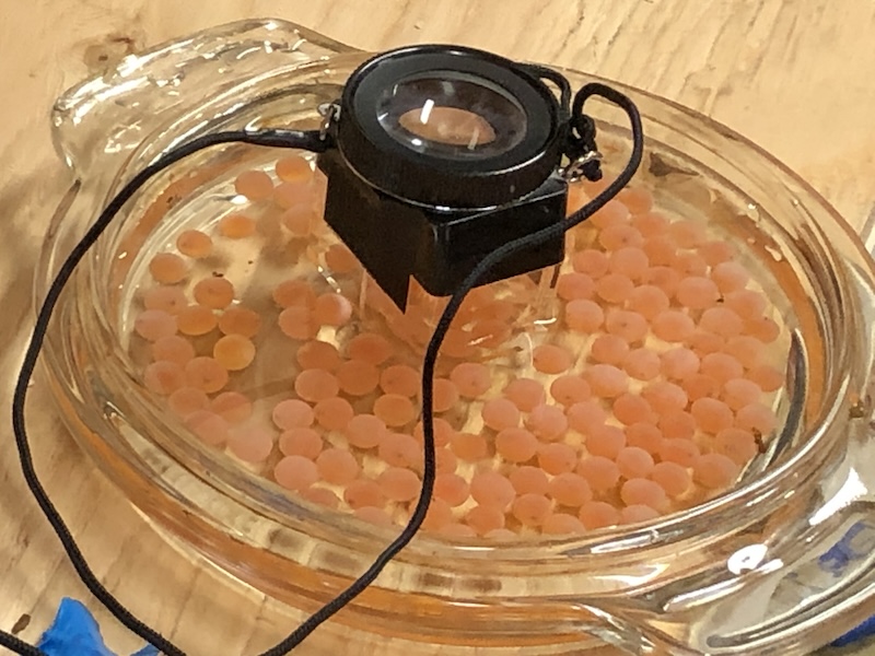 Cec Robinson: “Today was shocking the eggs that we have in the Klahoose hatchery. Shocking, picking out the dead ones and counting what we’ve got. The shocking is a simple process of physically shocking the egg to break a little membrane inside any of the non viable eggs. This little membrane will fracture and when the water gets in, it turns the egg white. So you know which ones are not viable and you pick them out. So it’s a case of counting or weighing the number of live and the number of dead. We want to know the percentage of the survival, how many eggs we’ve taken and the level of fecundity of the females. That’s of all super interest to DFO.”