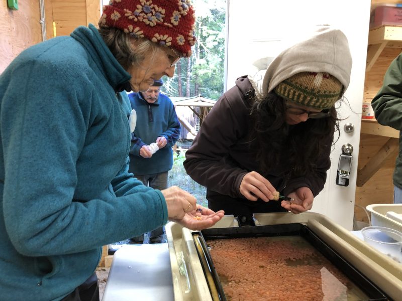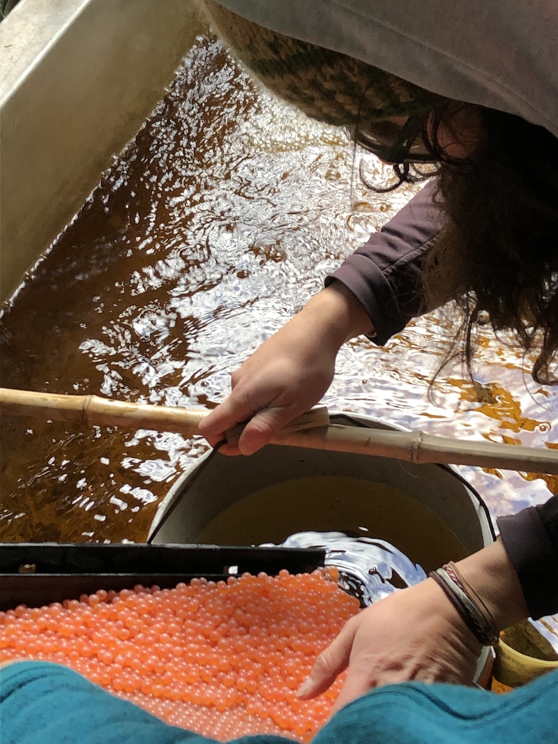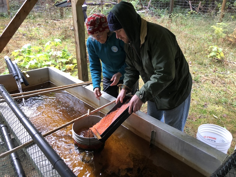 Evelyn Underhill explained, “I just started a month ago. I work as a kayak guide. I always thought the salmon were pretty special. It’s cool to work in the ecosystem when they go out to the ocean, and see how their health affects everything else. I’ve never seen the eggs because I work on the ocean. It was nice to see where it all starts.”