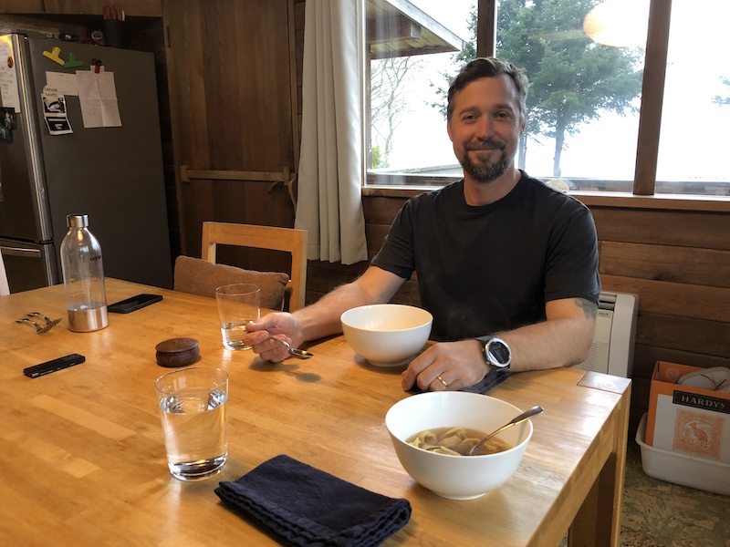 Trever sitting down to a duck tortellini lunch