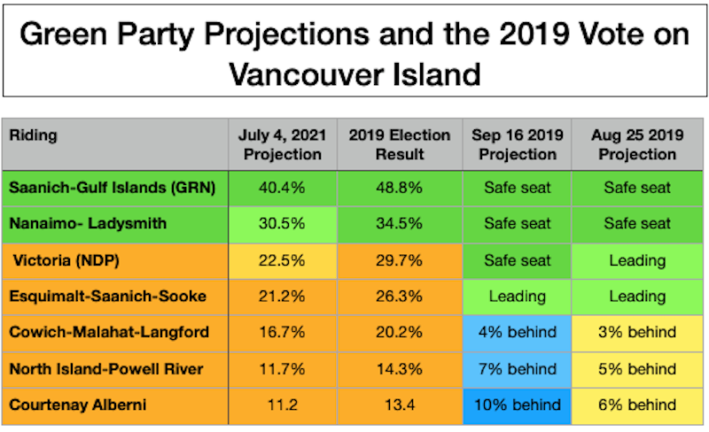 The most recent 338Canada’s projection was made a week ago, at which point the Greens were leading in two Vancouver Island ridings: Saanich-Gulf Islands (a safe seat) and Nanaimo-Ladysmith (where they allegedly lead by a mere 1%).