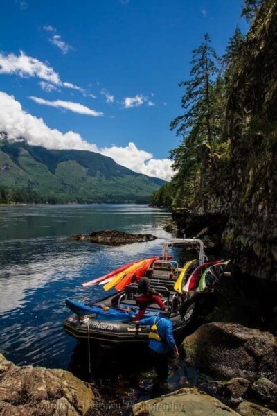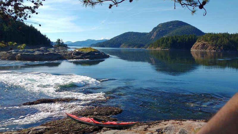 Surge Narrows is only a 15 minute paddle from the government dock at Hoskins landing. A 3-4 foot wave forms during the flood, which makes this a relatively safe place to learn how to handle a kayak in fast moving tidal water.