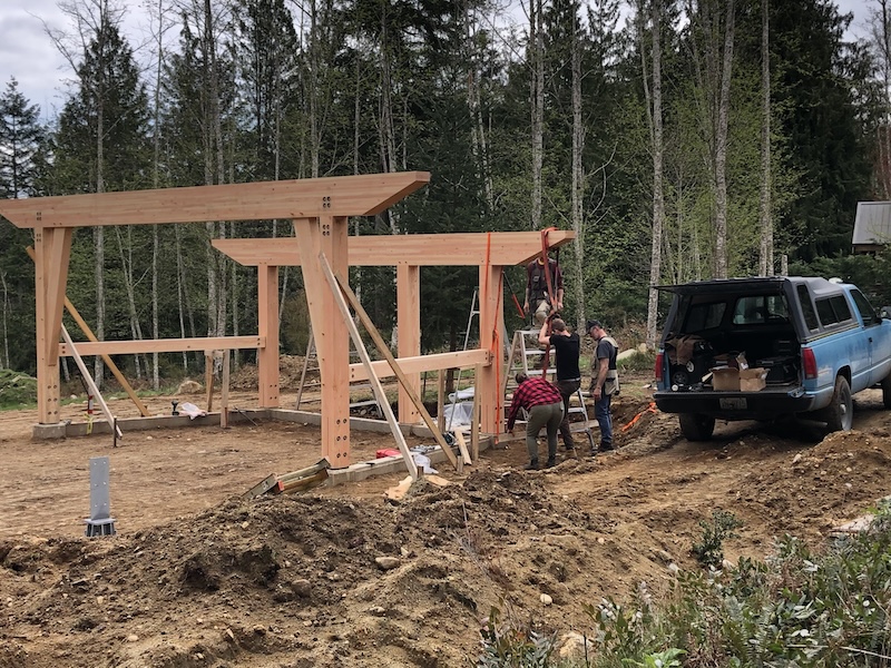 “ You see these two forward footings. They will be taking yet another set of another pair of posts and braces and one more large beam. That’s the big, long black package lying right there. It’s about 39 feet long. They are are big glulam beams and the frame was made by Island Timber Frame out of Cumberland.”