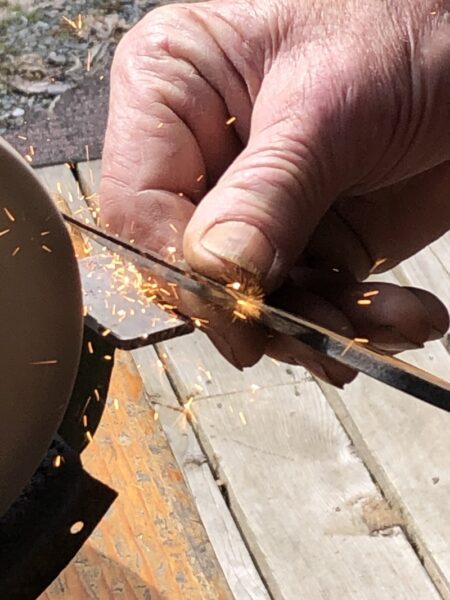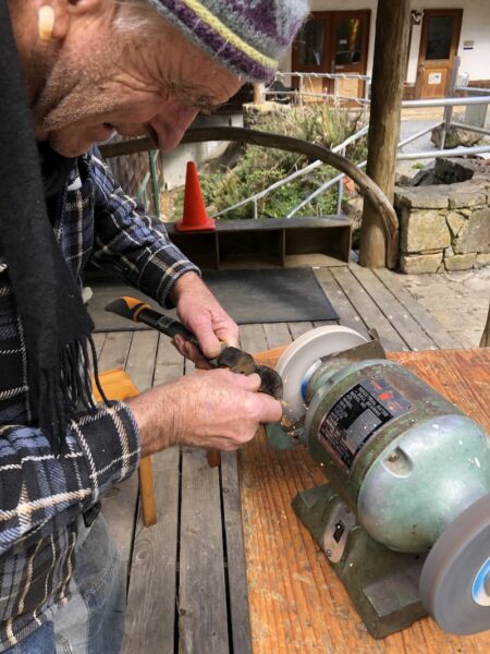 The first workshop was “Get Sharp with Bill Wheeler.” People brought their tools. He cleaned and sharpened them, while explaining how they could do this themselves. As the crowd kept growing and I didn’t want to interrupt everything to ask if they minded being recorded, I decided to interview someone about their experience.