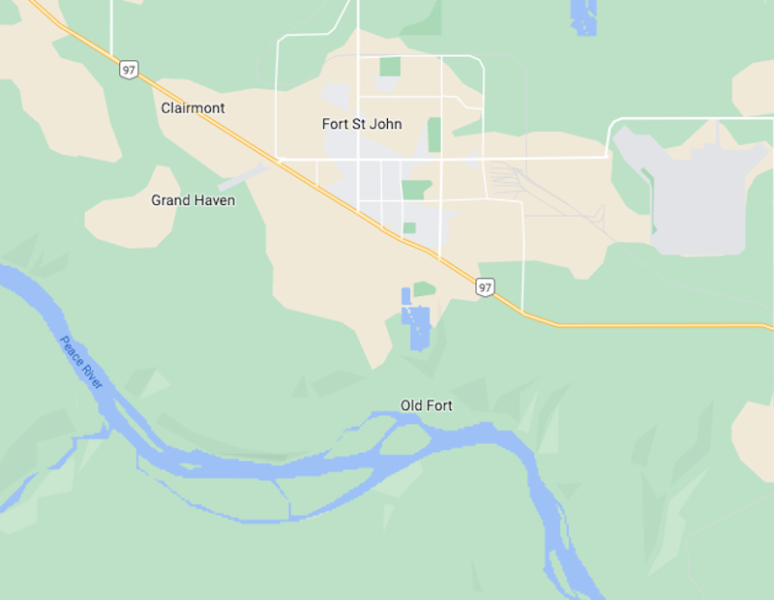 Old Fort is 4 miles south of Fort St John, on the north bank of the Peace River – courtesy Google Maps