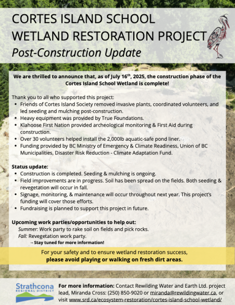 Miranda Cross: “The Cortes Island School Wetland Project is a wetland restoration project funded through the Ministry of Environment and Climate Readiness through the Union of BC Municipalities and a fund called Disaster Risk Reduction-Climate Adaptation Funding. This is a partnership project between the Strathcona Regional District, school district 72 and the Cortes Island School.”