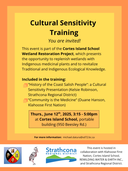 “Duane Hanson has been really instrumental in engaging with the elders and starting the process of talking about traditional plant medicines and sharing appropriate knowledge with the community and the school. We’re developing signage , so there’ll be an interpretive walk through the wetland area and riparian area surrounding the wetlands that will describe some of the plants that we’ve planted and the cultural relevance and the traditional ecological knowledge that’s been shared from the Klahoose elders that we’re working with.”