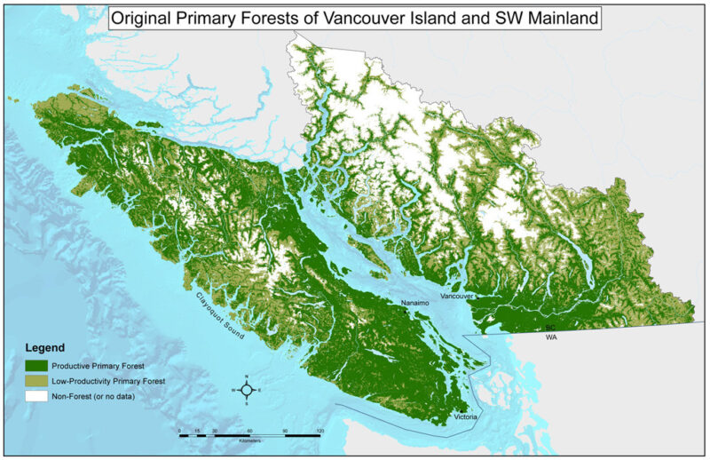 The above map is ten years old; yet more old-growth has been logged since it was drawn. This is how much of it there was before Anglo/Euro settlers commenced serious commercial exploitation of the forest: