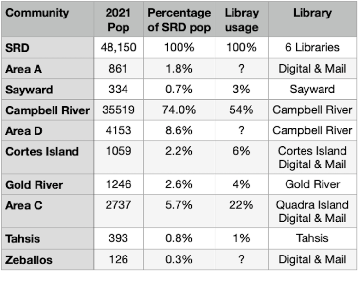 He said there is a library in Campbell River, which is contributing about $700,000 below the average funding amount. It also serves Electoral Area D, which is paying $30,000 less than norm. The library on Quadra Island serves Area C, which also provides about $30,000 less. There are libraries in Gold River, Sayward, Tahsis and Cortes Island, all of which pay about $16,000 below the average amount. Heyman claims Electoral Area A and the village of Zeballos, which do not have library branches, should also be providing another $16,000.